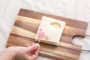 2、もう1枚にマヨネーズをビアハム、スライスチーズをのせてマヨネーズを塗った1の食パンと重ねる。