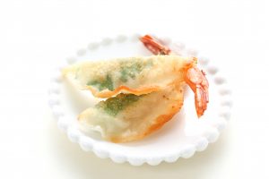 1、海老は殻と背ワタを取り腹部分に3か所切り込みを入れて伸ばす。スライスチーズは8等分に切る。大葉は半分に切る。
