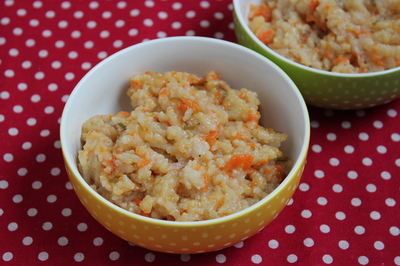 2 3合炊きの炊飯器に、米0.5カップ、人参シリシリ、塩昆布スーチカーの茹で汁2.5カップをくわえ、メニューボタンで「おかゆ」を選び、炊飯する。スーチカーと水でもよい。スーチカーががない場合は豚こまを袋に入れて塩を加えてよくもみ、1日置いたもので代用してもできます。