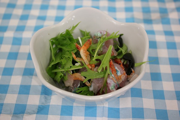 水菜、わかめ、桜えびが入っているので目で見ても楽しめる、味噌和えです。