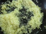 フライパンに大さじ1のオリーブ油と島にんにくを入れ、香りが出てきたら弱火でたまねぎを炒める。透明感が出てきたら米を加え、米粒が透き通るまで焦がさないように手早く混ぜる。