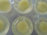 容器の半分までくず餡を入れ、パインアップル餡を5g、中央に入れる。その上に、くず餡をかぶせるように10分目まで入れる。冷蔵庫で30分冷やす。