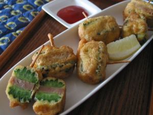ほろ苦いゴーヤを甘い衣で揚げました。