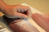 身をひっくり返して背中側からも包丁を入れる。尾ビレのつけねから頭に向かって切り込みを入れる。ここでも、刃先が背骨にあたるところまで入れながら、切り進める。