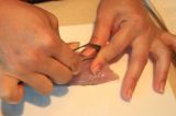 左手(包丁を持っていない手)で尾ビレ側の皮をつかみ切り込みを入れる。包丁を寝かしたまま皮を動かし手前にひいていく。