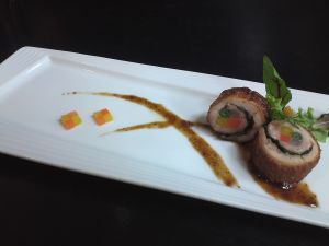 ソースをナベに戻し軽く詰め、白ワインビネガーを加え、コーンスターチでトロみをつけ、味をととのえたら<6>を器にので、ソースをかけて完成です。
