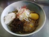 沖縄の自然を一つの器に盛りこみました。 植物の緑を苦菜麺 太陽をウコンで色付けした味付け卵 雲をゆしどうふ 海をモズク で表現しました。